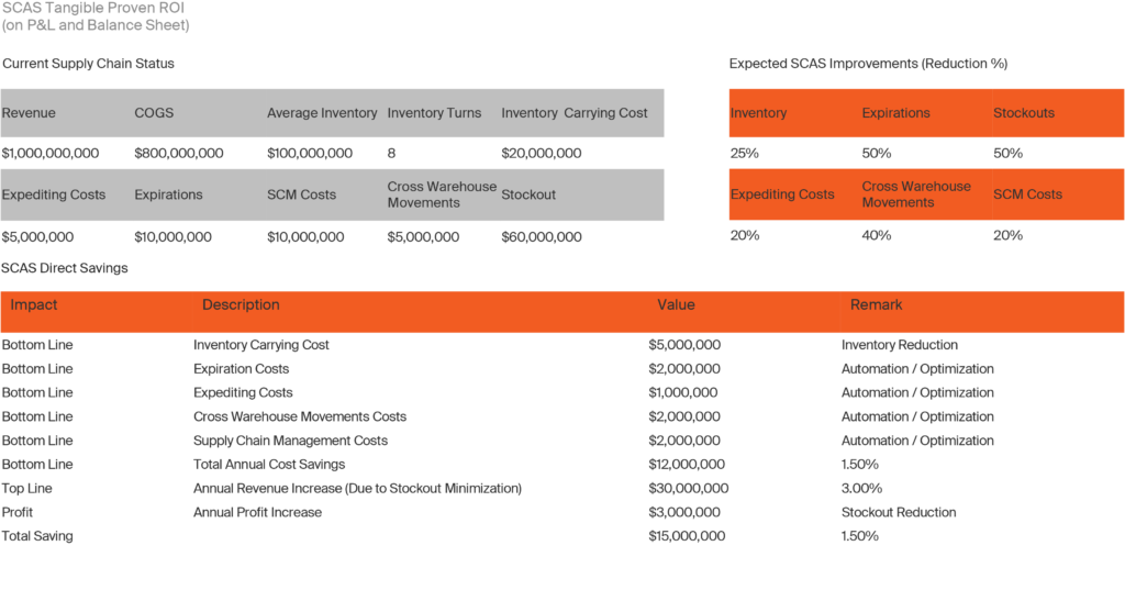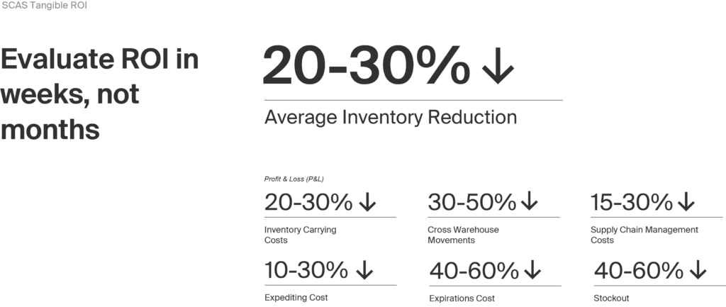 For a billion dollar outbound supply chain with 100 million in average inventory and eight annual turns, SCAS reduces inventory by up to 25%, stockouts by up to 50%, and transportation costs by up to 40%.