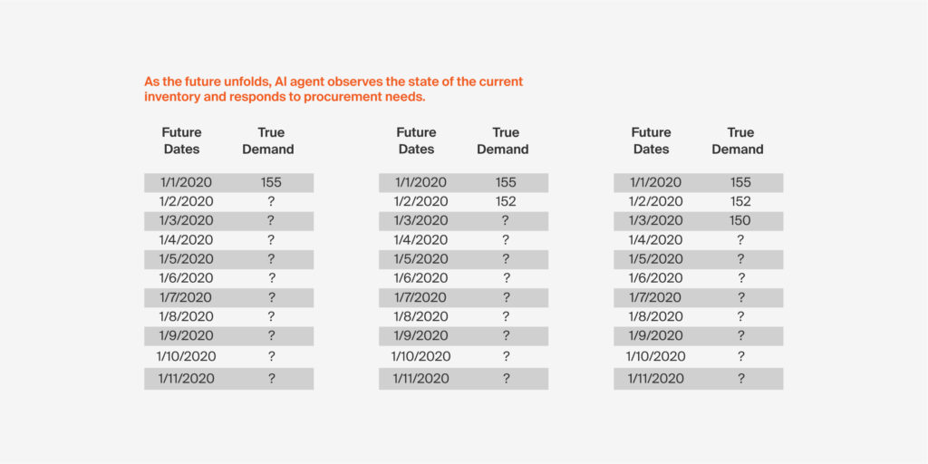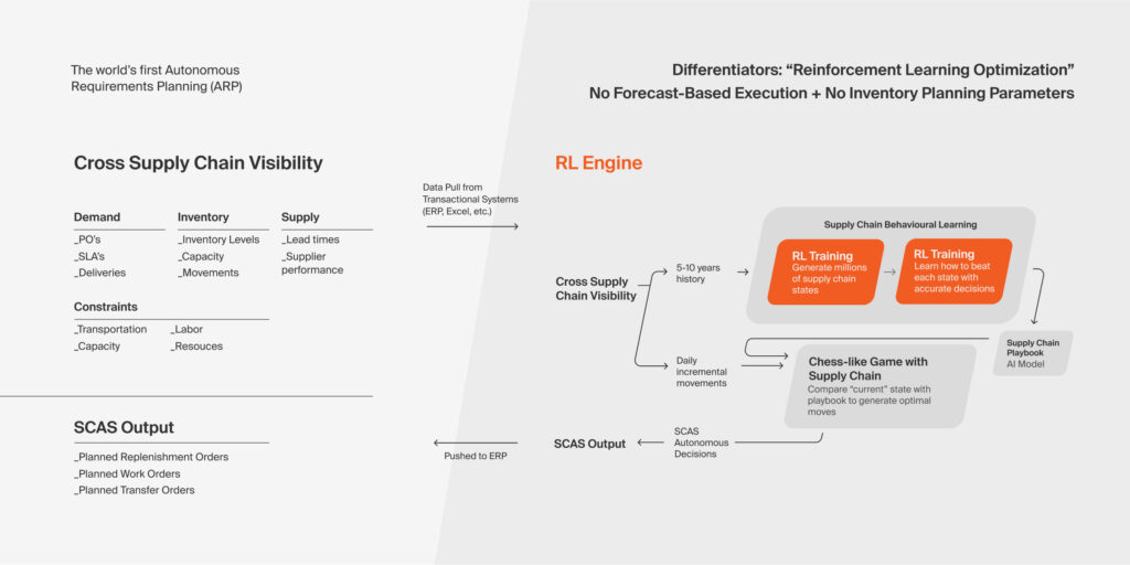 Similar to a chess game with millions of possible scenarios, SCAS looks at millions of possibilities, determining the best possible move and acting upon it. It begins by assessing historical data characterizing the supply chain behavior on the demand, inventory, and supply sides (“Cross Supply Chain Visibility”). Based on cross supply chain event correlations through the underlying Reinforcement Learning Engine, SCAS learns the overall behavior (e.g., probability distributions) of the past at all levels of granularity (product/location/time). SCAS then uses this learning to extrapolate an extensively large number of potential scenarios characterizing the supply chain behavior in the near future.